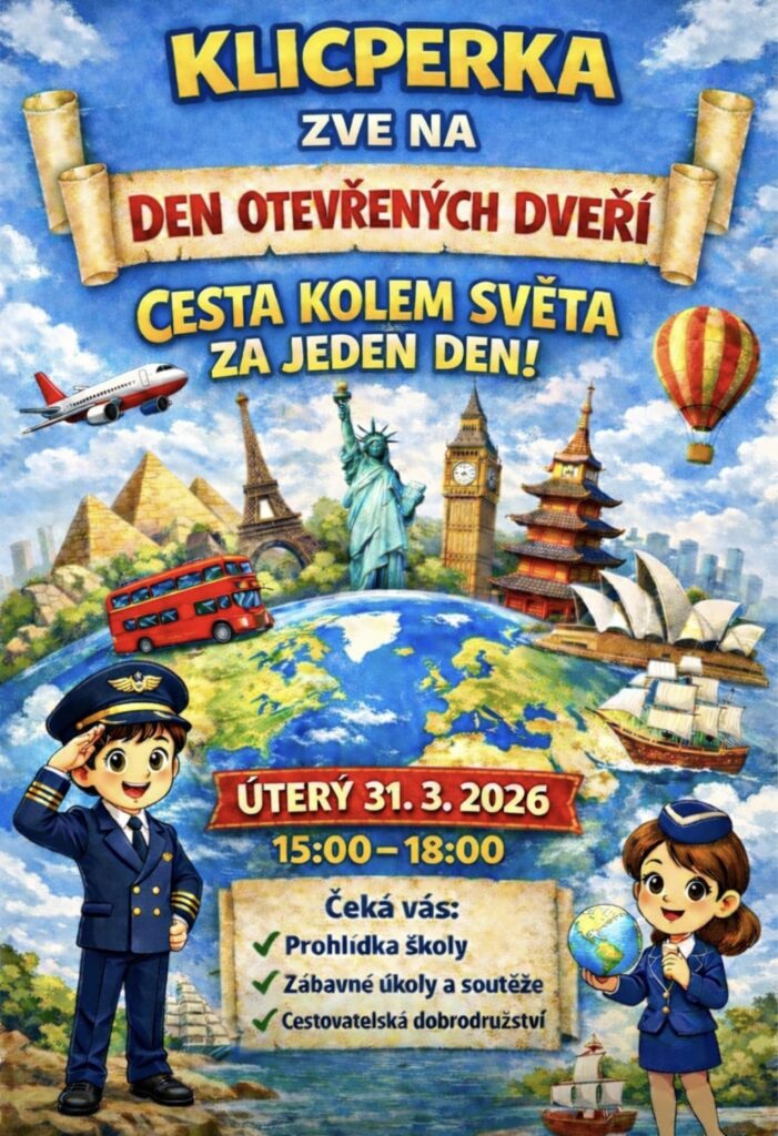 Připravte si kufry, kompas i široký úsměv – na Klicperce se v úterý 31. 3. 2026 od 15:00 do 18:00 otevřou brány světa! Přijďte na náš Den otevřených dveří a vydejte se s námi na dobrodružnou cestu kolem planety plnou zábavy, objevů a překvapení.