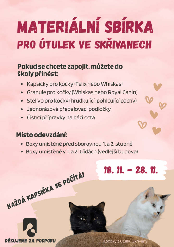#JSEMLASKAVEC – pokračujeme a zdaleka nekončíme! Naši žáci se rozhodli spojit síly a pomoci majitelce útulku ve Skřivanech. O opuštěné pejsky a kočičky se s láskou a trpělivostí stará již více než 30 let. V útulku se nachází staří a vážně nemocní pejsci, vyžadující speciální stravu a léky. Jejich adopce z těchto důvodů není možná. Se slzami v očích jsme vyslechli příběh o každém z nich.