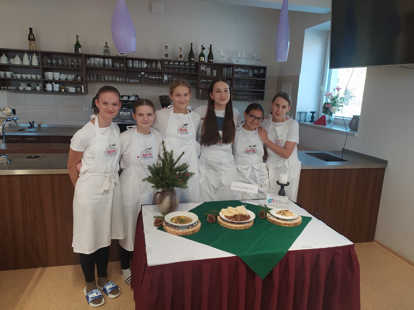V říjnu a listopadu se náš šestičlenný tým děvčat zúčastnil dvou gastronomických soutěží, které pořádala SŠTŘ Nový Bydžov – Peče celá Cidlina a MasterChef Junior. Téma soutěže v pečení bylo „Podzimní svatba“. Naše soutěžící připravovaly svatební perníčky, cupcakes a svatební koláčky plněné různými náplněmi. Hodnotila se chuť, kvalita provedení a estetické servírování.Ve vaření se dívky pustily do tématu „Z lesa na talíř – s vůní jablek a majoránky“. Připravovaly bramborovou polévku s houbami, srnčí guláš s kynutým knedlíkem a jablečný závin. Stejně jako u pečení byla důležitá týmová spolupráce a navíc i celková prezentace.Na obě soutěže se poctivě připravovaly ve škole, ale i doma. Byly skvěle sehrané, navzájem se podporovaly a v týmu panovala výborná nálada. Dne 26. 11. proběhlo v Chlumci nad Cidlinou slavnostní vyhlášení výsledků, kde se setkaly všechny zúčastněné týmy. Naše děvčata vybojovala 4. místo v pečení a 5. místo ve vaření. Podívejte se do fotogalerie.